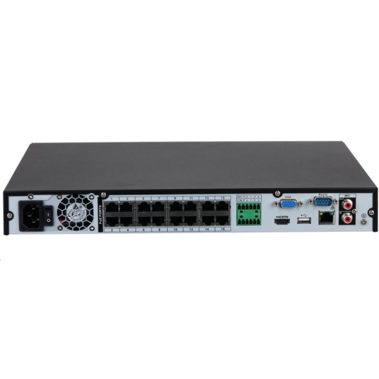 1× 10/100/1000 MbE RJ-45, 16× 10/100 Mbps RJ-45 PoE (IEEE 802.3 af/at), 1× audio vstup (RCA), 1× audio výstup (RCA), 4× alarm vstup, 2× alarm výstup, 2× USB 2.0, pozice pro 2× SATA HDD (max. 20 TB/disk), 1× HDMI, 1× VGA, 1× RS-232.