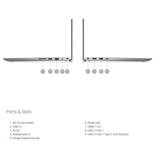 1. SD 3.0 card reader 6. Power jack Upozornenie: U tohto modelu podporuje USB-C iba prenos dát. Nepodporuje dokovanie, obrazový výstup (DisplayPort), ani funkciu PD (Power Delivery). |