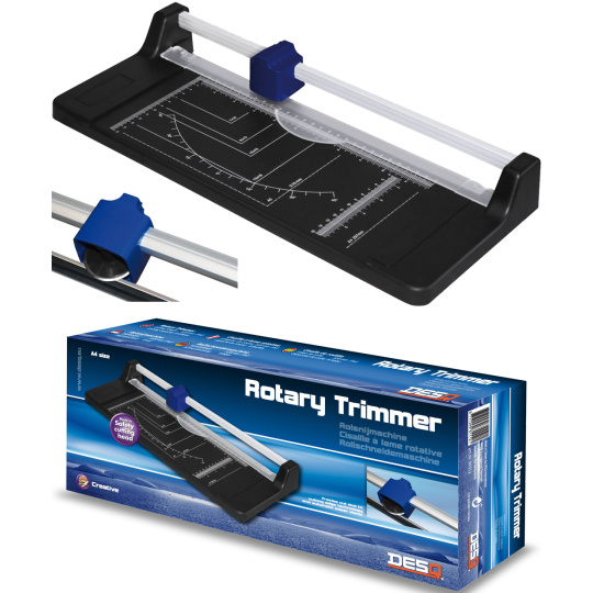 Odolná rotační řezačka pro přesné řezání papíru a kartonu. ? Rotační a spodní čepel pevně připevněné k pracovní desce ? Řez až 8 listů papíru najednou ? Vyobrazené standardní formáty A pro snadné zarovnání ? Úhlová stupnice pro přesné řezání pod úhlem Perfektní nástroj pro kancelář, školu i domácí kreativní projekty..