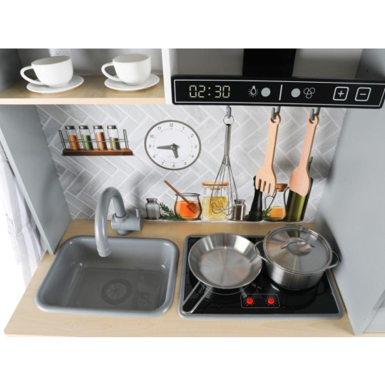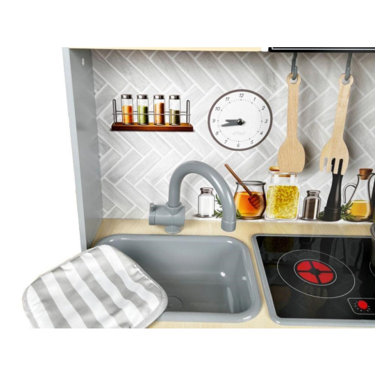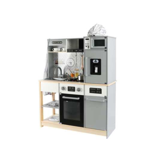 Dětská kuchyňka vybavená moderními spotřebiči, doplněná o bohaté příslušenství a textilní kuchařský set ZDARMA, okouzlí holčičky i chlapce. Dřevěná kuchyňka ve skandinávskému stylu je vhodná do každé místnosti. Díky této krásné edukativní hračce si děti vyzkouší vaření, pečení, chystání pokrmů, umývání nádobí a další činnosti bezpečným dětským způsobem. Při hře v moderní kuchyňce děti zdokonalí své dovednosti a ještě si užijí spoustu zábavy..