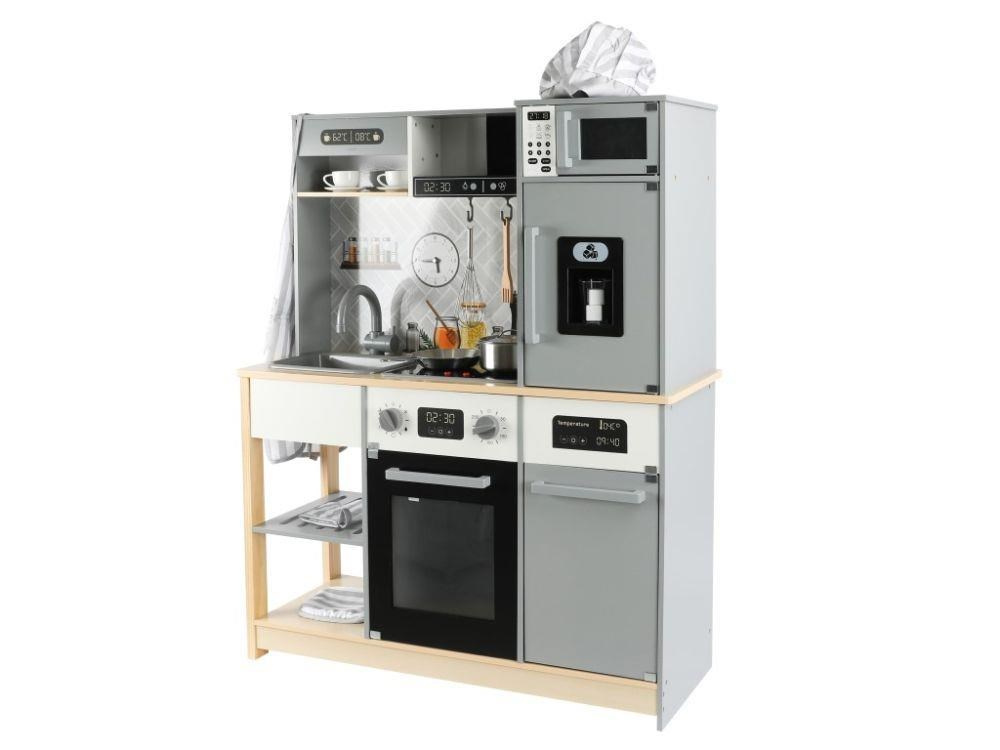 Dětská kuchyňka vybavená moderními spotřebiči, doplněná o bohaté příslušenství a textilní kuchařský set ZDARMA, okouzlí holčičky i chlapce. Dřevěná kuchyňka ve skandinávskému stylu je vhodná do každé místnosti. Díky této krásné edukativní hračce si děti vyzkouší vaření, pečení, chystání pokrmů, umývání nádobí a další činnosti bezpečným dětským způsobem. Při hře v moderní kuchyňce děti zdokonalí své dovednosti a ještě si užijí spoustu zábavy..