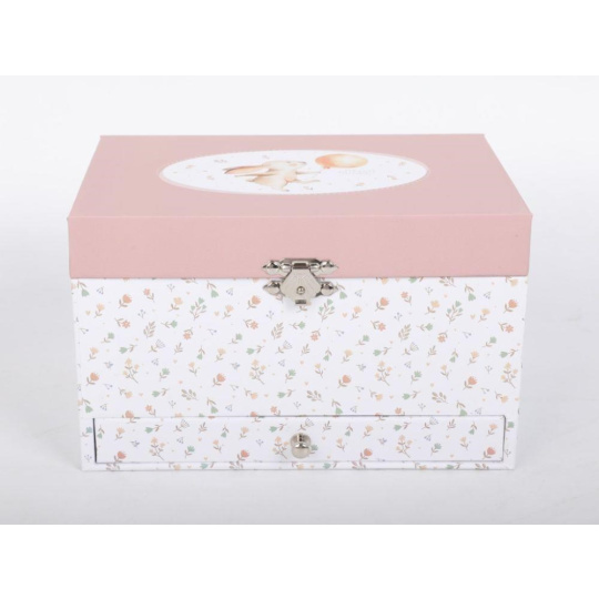 Dětská šperkovnice zdobená drobnými květy, s roztomilým zajíčkem na víku, okouzlí každou malou parádnici. Šperkovnice pro děti, s členěným vnitřním prostorem a praktickou zásuvkou ve spodní části nabízí dostatek místa pro uložení prstýnků, dívčích šperků, drobných pokladů. Uvnitř šperkovnice se ukrývá nejen zrcátko, ale i něžná baletka, která vaší holčičce ráda zatančí..