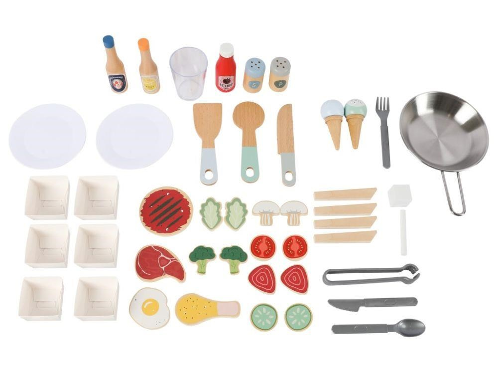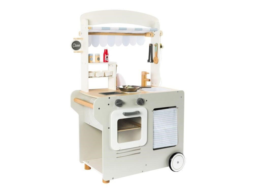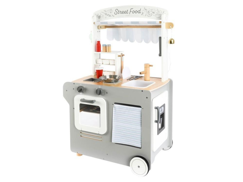 Pojízdná dětská prodejna (občerstvení) je parádním dřevěným obchůdkem, se kterým si děti mohou hrát kdekoliv - ve svém dětském pokoji, v kuchyni, v obývacím pokoji. Pojízdná prodejna je vybavená spotřebiči pro vaření, pečení a smažení, ledovačem, dřezem na nádobí, kuchyňskými potřebami, potravinami, stolečkem se stoličkou, tabulí a dalšími doplňky. Kolečka a dřevěné madlo usnadní přesun i manipulaci..