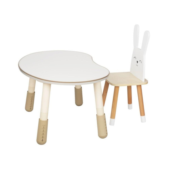 Dětský rostoucí set nábytku, rostoucí stůl a rostoucí židle Králíček, je krásným doplňkem do dětského pokoje, který poroste s vašim dítkem. Bílý králíček bude dětem dělat společnost při svačince, kreativních činnostech i při hře u oválného stolečku. Díky neutrálním barvám je dětský stolek s židličkou vhodný pro holčičky i chlapce, do každého interiéru..