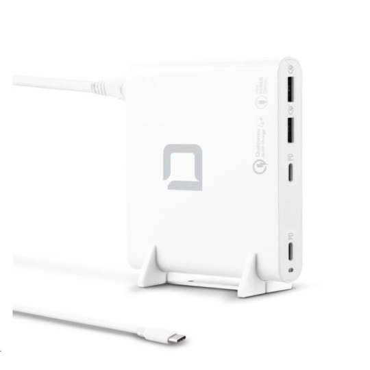 Nabíječku lze používat ve více než 180 zemích a je vybavena dvěma výstupy USB-C s technologií Power Delivery 3.0 a dvěma porty USB-A s technologií Qualcomm Quick Charge 4.0+. Maximální výkon nabíjecí stanice je 120 W. Výstupní napětí (5 - 20 V) a nabíjecí proud (až 5 A) se automaticky přizpůsobují připojeným zařízením. Inteligentní řídicí systém šetří baterii a zároveň nabízí spolehlivou ochranu proti nadproudu, přepětí, zkratu a přehřátí. Elegantní design, kompaktní tvar a hmotnost pouhých 240 gramů - ideální společník pro rychlé a efektivní získávání energie doma, v kanceláři nebo na cestách. Součástí je plastový stojánek, který zabraňuje přehřátí.