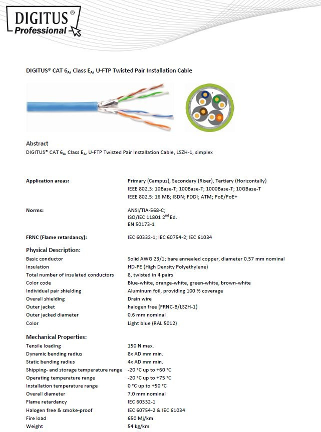 DIGITUS CAT 6A U-FTP Kabel 4x2,drát AWG23, LSOH, modrý, 305m - 4x2 AWG23 drát, čístá měď - Kategorie CAT6A vyhovuje normě ISO/IEC 11801, TIA/-586-C.2, EN 50173 - Nejvyšší podporovaný protokol: 1000BaseT, Gigabit Ethernet - 500MHz - Barevně odlišené žíly - Páry jsou jednotlivě stíněny hliníkovou folií - Celek je nestíněný - Izolace: SFS-PE - Plášť: LSOH - NVP: 70% - Zatížení: 150N max. - Dynamický radius v ohybu: 8x AD mm min. - Static bending radius: 4x AD mm min. - Skladovací teplota: -20°C až 60°C - Teplota při instalaci: 0°C až 50°C - Barva pláště: světle modrá - Délka kabelu v balení:305m na dřevěné cívce Instalační kabel CAT6A zaručuje dlouhou životnost, maximální výkon a bezproblémový chod počítačové sítě. Instalační kabel - CAT6A je určený pro horizontální rozvody a bez problémů splňuje požadavky definované v mezinárodních standardech ISO/IEC 11801, TIA/-586-C.2, EN 50173 pro CAT6A a je proto vhodný i pro provoz těch nejnáročnějších protokolů určených pro strukturovanou kabeláž. e proto vhodný i pro provoz těch nejnáročnějších protokolů určených pro strukturovanou kabeláž..