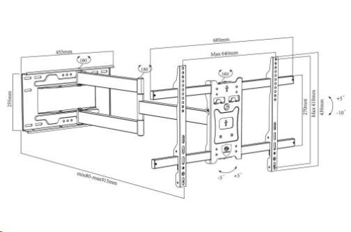 Dlouhý otočný držák na televize Ergosolid ONYX-20 Výborný držák s délkou 80-915mm a možností otočit Tv 70" kolmo ke zdi na obě strany Kvalitní nástěnný držák pro zavěšení televizorů s úhlopříčkou 43" až 75", televizory s úhlopříčkou do 70" lze na držáku otáčet kolmo ke zdi na obě strany. Konstrukce držáku je ocelová a zajiští bezpečné a spolehlivé zavěšení televizorů, které mají hmotnost až 45kg. Televizi lze nejen otáčet do stran, ale i naklápět nahoru nebo dolů a měnit vzdálenost od zdi. V případě nepřesné instalace nebo nerovností držák umožňuje korekci až +/- 5°. Podporuje VESA standardy 200x100 až 600x400. Barevné provedení černé, záruka 3 roky. Extra dlouhý držák na Tv pro otáčení Tv až 70" kolmo ke zdi - ergosolid onyx20 Technické údaje: nosnost 45kg VESA standardy 200x100 až 600x400 na televize 43" až 75" otáčení Tv do stran +/- 90° Tv s úhlopříčkou do 70" lze otočit i kolmo ke zdi na obě strany vzdálenost Tv od zdi 80-915mm náklon +5° / -10° korekce roviny +/- 5° kvalitní ocelová konstrukce bezpečný a spolehlivý držák balení obsahuje sadu instalačního materiálu barva černá záruka 3 roky.
