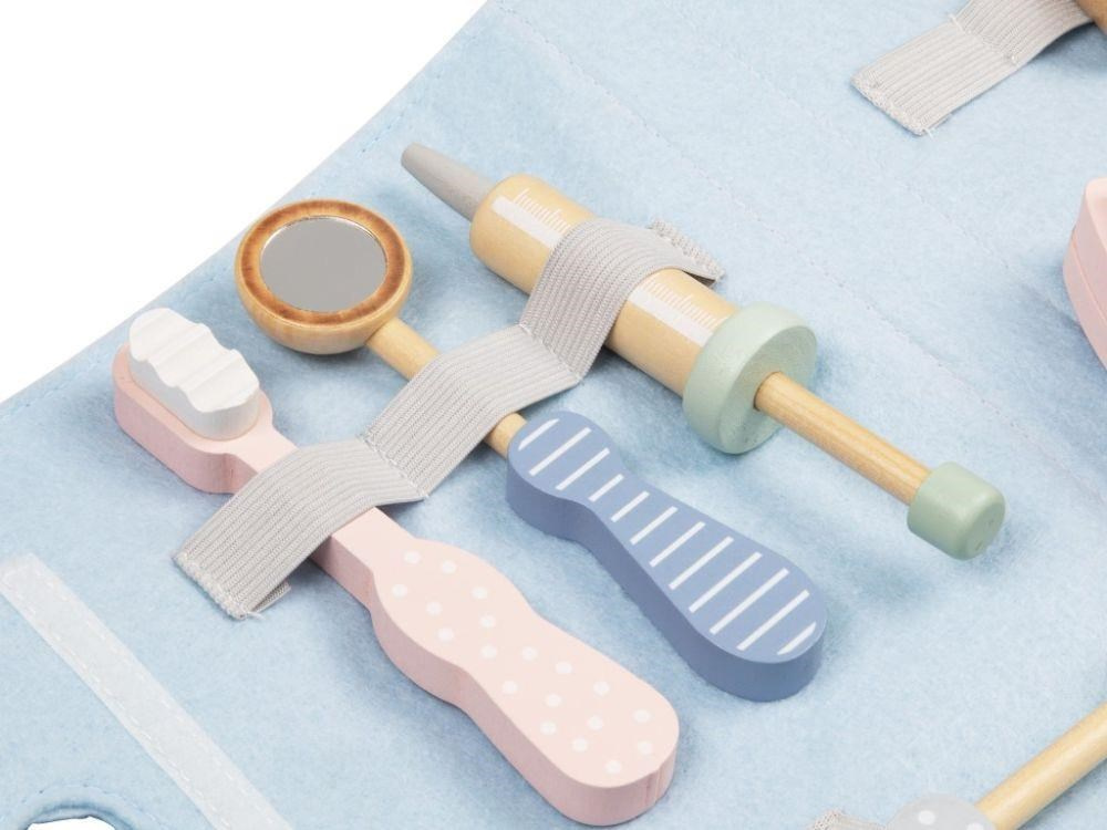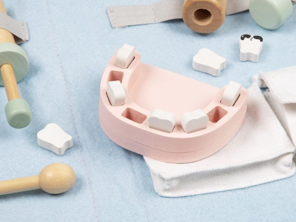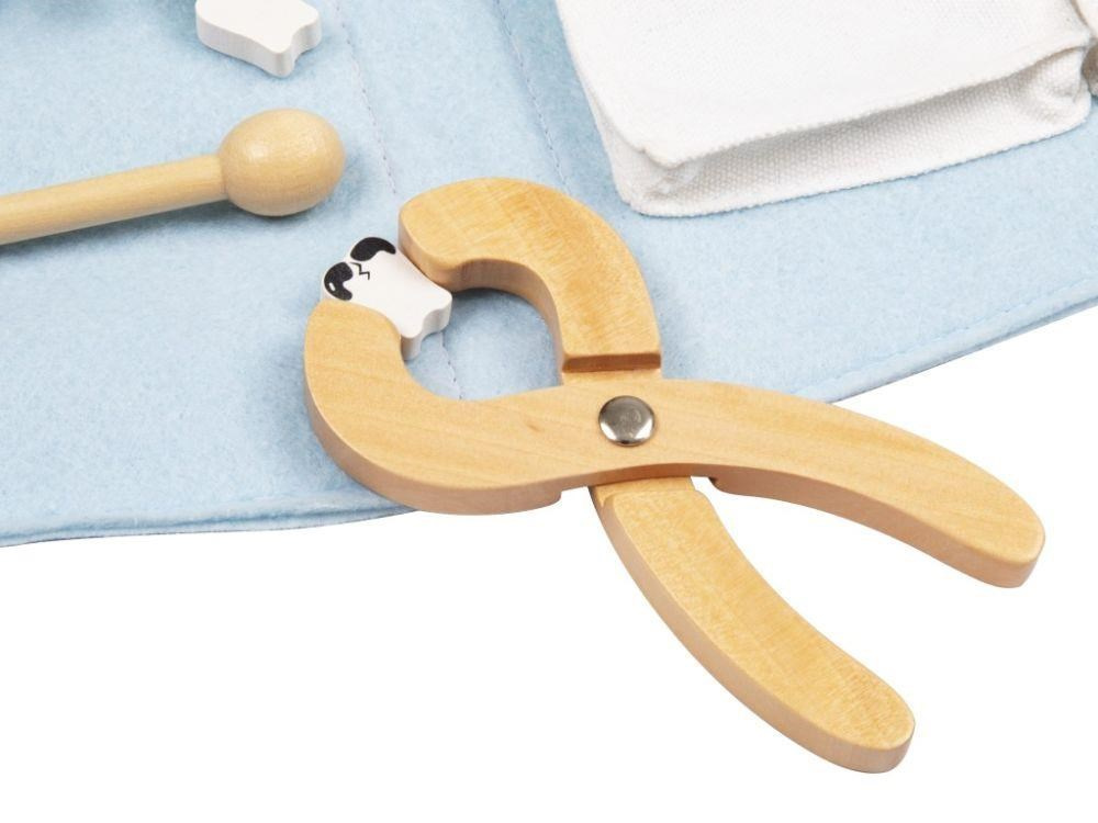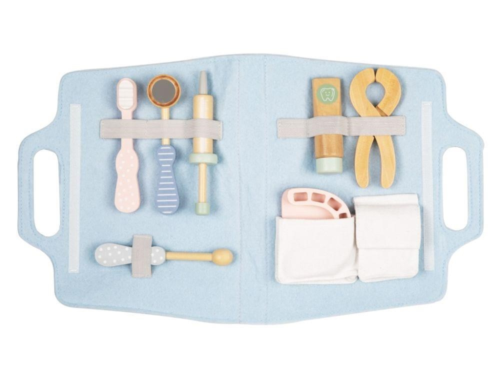 Doktorský kufřík (brašna) pro děti s vybavením pro malé zubaře je originální hračkou, se kterou se děti seznámí nejen se svými zoubky, ale i co obnáší profese zubaře. V roli zubaře nebo zubařky si děti vyzkouší vrtání zkažených zubů i jejich trhání. Na této hračce můžete svým dětem předvést, jak se správně čistí zoubky a jak to dopadá, když se ústní hygiena zanedbá. Pro snadný úklid i přenášení je sada uložena v praktické modré brašně..