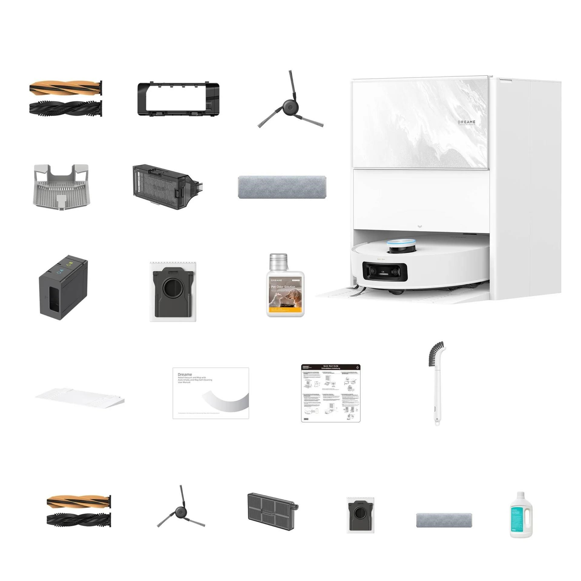 - Obsah balení: Robotický vysavač, Hlavní kartáč (předinstalovaný), Kryt hlavního kartáče (předinstalovaný), Boční kartáč (předinstalovaný), Stírací systém / stírací lišta mopovacího válce (předinstalováno), Nádoba na prach s filtrem (předinstalovaná), Multifunkční dokovací stanice, Prodloužená deska / rampa základnové stanice (Washboard), HEPA filtr (předinstalovaný), Automatický dávkovací modul čisticího prostředku s dvojitou komorou (předinstalovaný), Čisticí roztoky (včetně varianty proti zvířecím pachům, množství dle distribuce), Prachové sáčky do stanice (1× předinstalovaný + náhradní), Čisticí příslušenství, Uživatelský manuál, Rychlý startovací průvodce