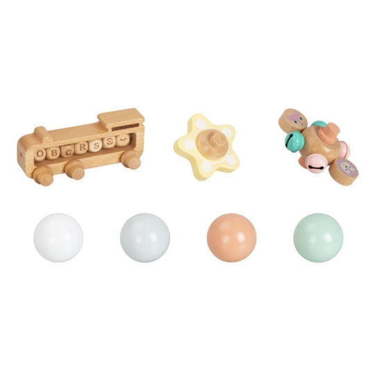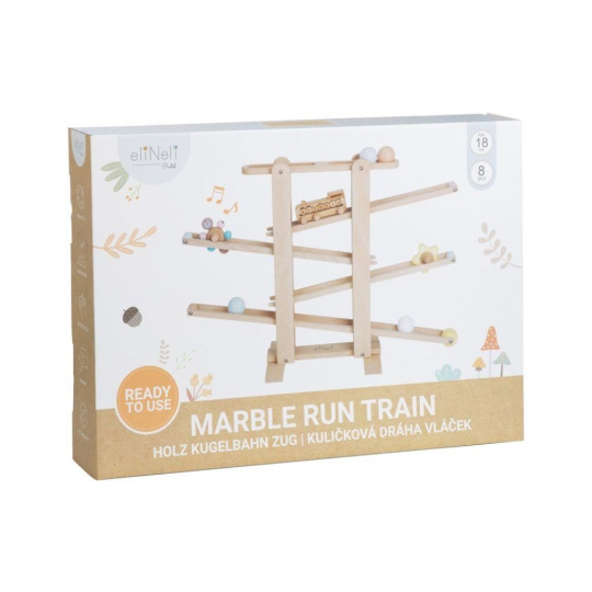 Již smontovaná dřevěná kuličková dráha XL, z tvrdého přírodního dřeva, s 6 dřevěnými zábavnými prvky a s parádním vláčkem ZDARMA je zábavnou hračkou pro děti i celou rodinu. Stačí správně umístit jeden z dřevěných doplňků (kuličku, kytičku, kolečko s rolničkami, vláček) do horního patra a sledovat co se bude dít. Hra s kuličkovou dráhou zdokonaluje dovednosti, učí děti soustředit se a trpělivosti, některé prvky stimulují smysly a naučí děti písmenka. Kuličkovou dráhu nemusíte skládat, je již smontovaná..