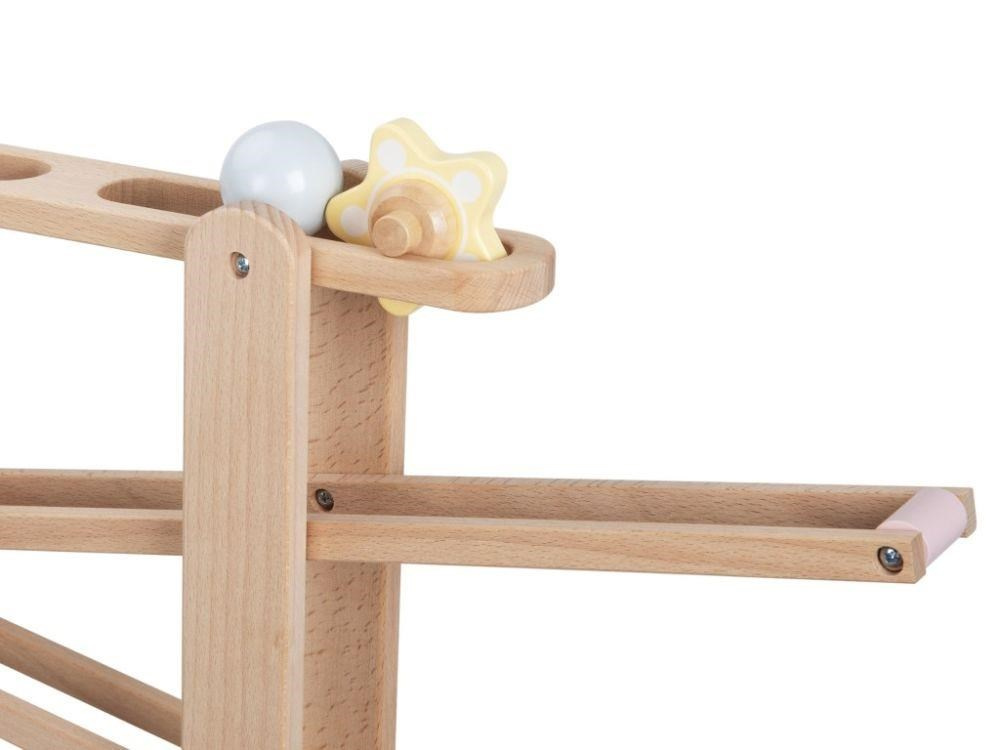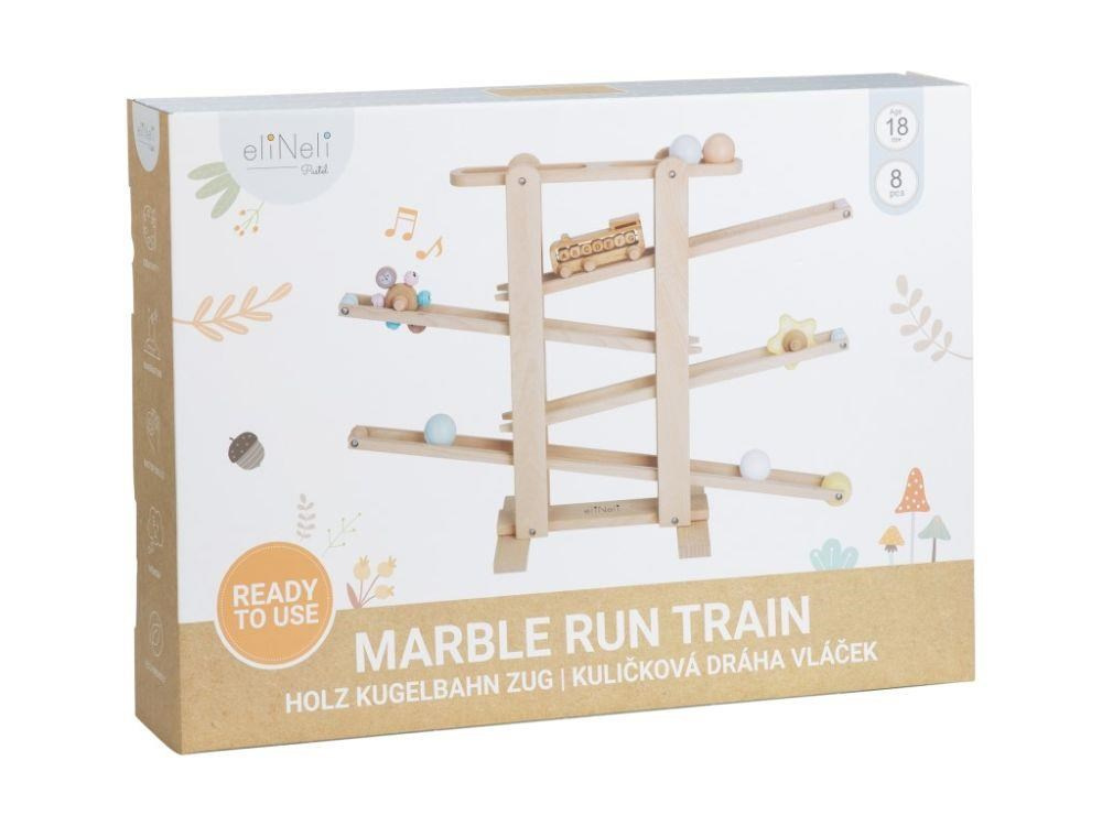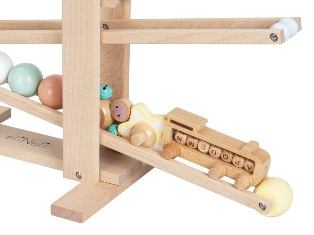 Již smontovaná dřevěná kuličková dráha XL, z tvrdého přírodního dřeva, s 6 dřevěnými zábavnými prvky a s parádním vláčkem ZDARMA je zábavnou hračkou pro děti i celou rodinu. Stačí správně umístit jeden z dřevěných doplňků (kuličku, kytičku, kolečko s rolničkami, vláček) do horního patra a sledovat co se bude dít. Hra s kuličkovou dráhou zdokonaluje dovednosti, učí děti soustředit se a trpělivosti, některé prvky stimulují smysly a naučí děti písmenka. Kuličkovou dráhu nemusíte skládat, je již smontovaná..