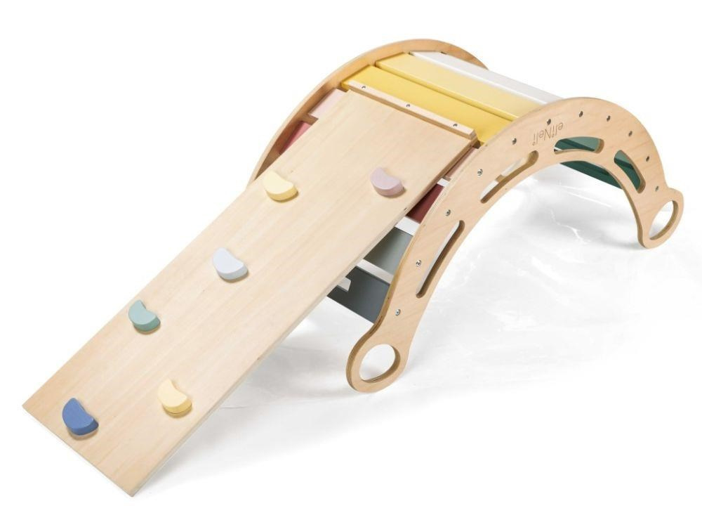 Velká dřevěná montessori houpačka 6v1, v setu se speciálním oboustranným prknem a židlí, vám umožní vytvořit duhový set dětského nábytku (stůl se židlí) téměř kdekoliv. Stejně snadno tento set proměníte v malé dětské hřiště se skluzavkou nebo lezeckou stěnou. Multifunkční montessori houpačka max umožní dětem příjemně se pohoupat, může být prolézačkou, skluzavkou, skrýší, mostem, s dalšími částmi setu stolečkem nebo dětským hřištěm. Pastelový set je vhodný pro děti již od 1 roku..