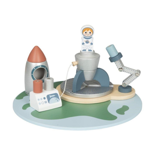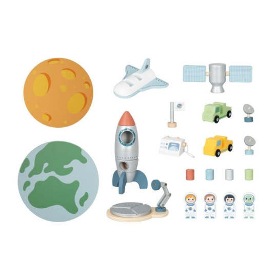 Dřevěná vesmírná základna se spoustou dřevěných prvků zavede děti do vesmíru. Hračka umožňuje dětem rozložit si základnu na Zemi i ve vesmíru, naplánovat start raketoplánu i vesmírnou misi na právě objevené planetě. Součástí balení jsou různé dopravní prostředky, satelity a astronauti..