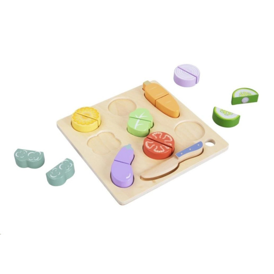 Dřevěná zelenina ke krájení je hračkou, která by neměla chybět v žádné dětské kuchyňce ani dětském obchůdku. 9 druhů zeleniny je rozděleno na poloviny spojené suchým zipem, díky kterému děti zeleninu dřevěným nožem jednoduše rozkrojí. Toto krájení zdokonalí motorické dovednosti a manuální zručnosti, děti si vyzkouší krájení bezpečným dětským způsobem. Balení obsahuje dřevěnou zeleninu, dřevěné prkénko i dřevěný nůž.