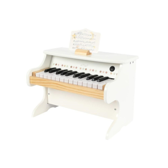 Dětské dřevěné piano (elektrické) v kombinaci moderní bílé barvy s přírodním dřevem, zdobené hvězdami, promění v hudební hvězdu každé dítě. Dřevěný dětský klavír po zapnutí vypínače a zmáčknutí kláves vydává krásné zvuky, odpovídající reálným tónům. Tato elektrická hudební hračka probudí v dětech lásku k hudbě, stimuluje smysly, rozvíjí kreativitu a fantazii..