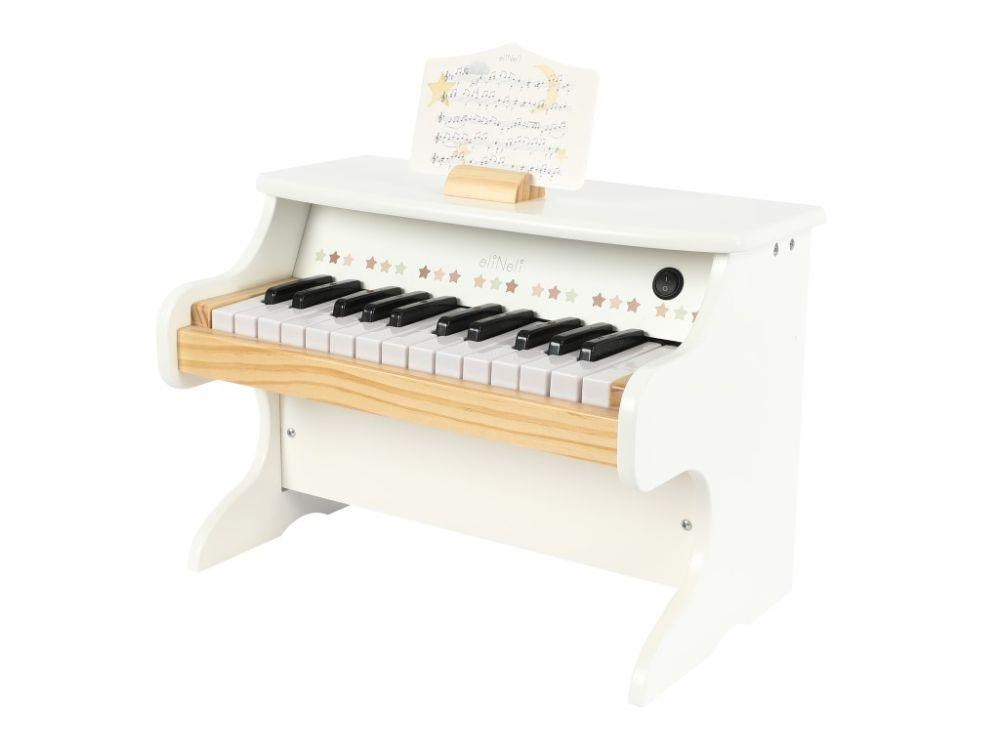 Dětské dřevěné piano (elektrické) v kombinaci moderní bílé barvy s přírodním dřevem, zdobené hvězdami, promění v hudební hvězdu každé dítě. Dřevěný dětský klavír po zapnutí vypínače a zmáčknutí kláves vydává krásné zvuky, odpovídající reálným tónům. Tato elektrická hudební hračka probudí v dětech lásku k hudbě, stimuluje smysly, rozvíjí kreativitu a fantazii..