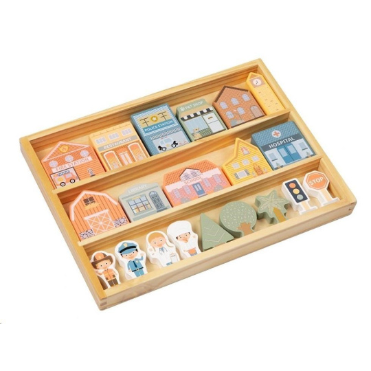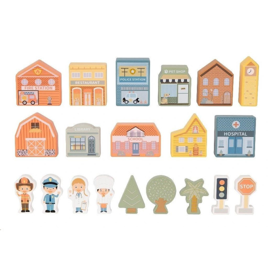 - Obsah balení: 20 dřevěných kostek (domečky, postavičky, stromy a dopravní značky).