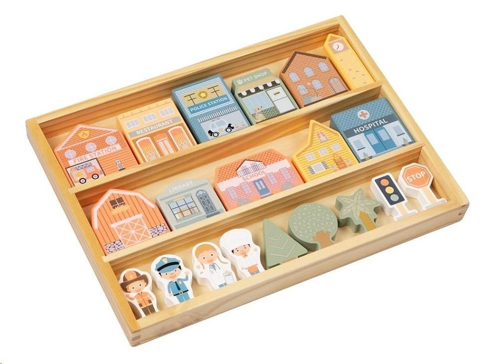 Dřevěné kostky patří mezi nejoblíbenější dřevěné hračky. S kostkami mohou děti popustit uzdu své fantazii, hrát si a stavět cesty, domečky i celá města. S dřevěnými kostkami město vybudují děti úžasné město s nemocnicí, policejní a hasičskou stanicí, se školou, knihovnou, obchůdky, obytnými domy a věčně zelenými stromy raz dva. Na dodržování pořádku dohlédne postavička policisty, o nemocné se postará pan doktor a pro případ požáru ve městě nechybí ani další hrdina - hasič. Dřevěné kostky krásné uložené v praktické krabičce si děti snadno přenesou na místo, kde si s nimi chtějí hrát, mohou si je vzít s sebou na návštěvu, na víkend k babičce i na dovolenou.