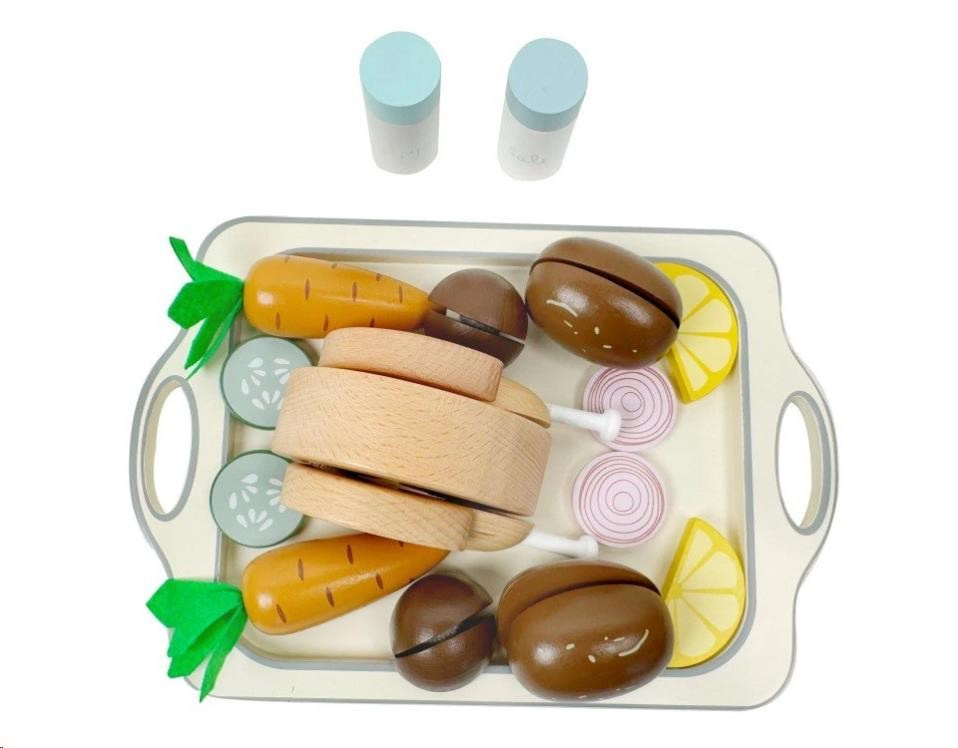 Dřevěné potraviny, zelenina, kuře, solnička s pepřenkou a velký tác usnadní dětem vaření a pečení v dětské kuchyňce. S touto dřevěnou sadou krájecích potravin bude pečení kuřete zábavnou hrou. Stačí ke kuřeti přidat oblíbenou zeleninu a potraviny, osolit, opepřit a vložit kuře do trouby. Upečené dřevěné kuře s oblohou na dřevěném tácu vypadá opravdu lahodně a je k nakousnutí.
