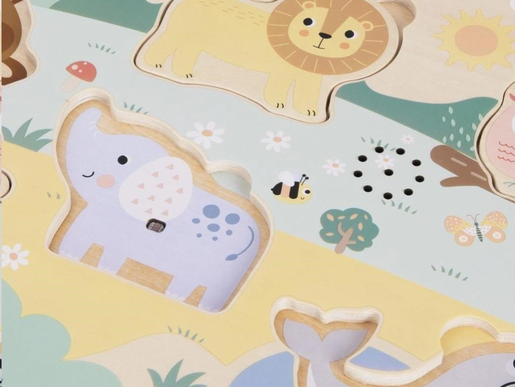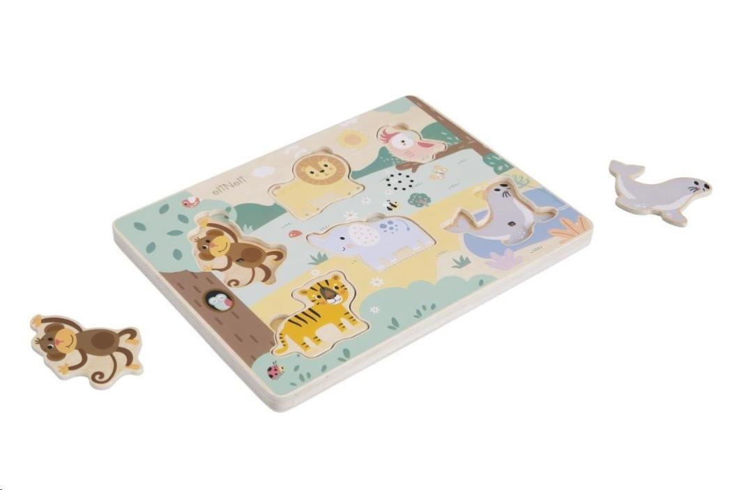 Zvukové vkládací puzzle s oblíbenými zvířátky - lvem, tygrem, slonem, lachtanem, opičkou a papouškem, zavede děti do ZOO. S dřevěnými puzzle dílky v podobě zvířátek děti potrénují motorické dovednosti, koordinaci očí, logické myšlení, stimulují smysly, naučí se trpělivosti, soustředit se a ještě si užijí spoustu zábavy.