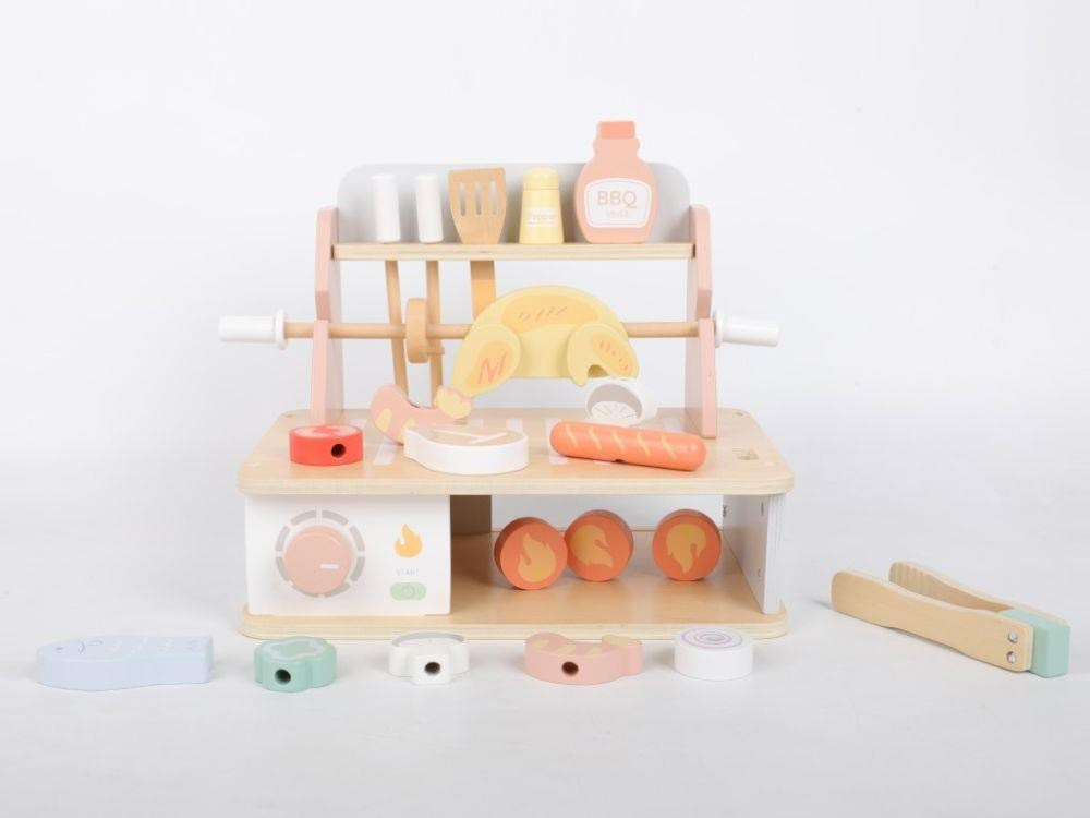 Dřevěný gril s bohatým příslušenstvím umožní dětem vyzkoušet si grilování bezpečným dětským způsobem. Uspořádat Barbecue slavnost bude hračkou a velkou zábavou. Žádná letní grilování se neobejde bez různých druhů masa, zeleniny a omáček, to vše v BBQ sadě najdete, včetně dalších doplňků pro přípravu masa a špízu. S dětskou BBQ sadou můžete grilovat celý rok, kdekoliv a v jakémkoliv počasí..