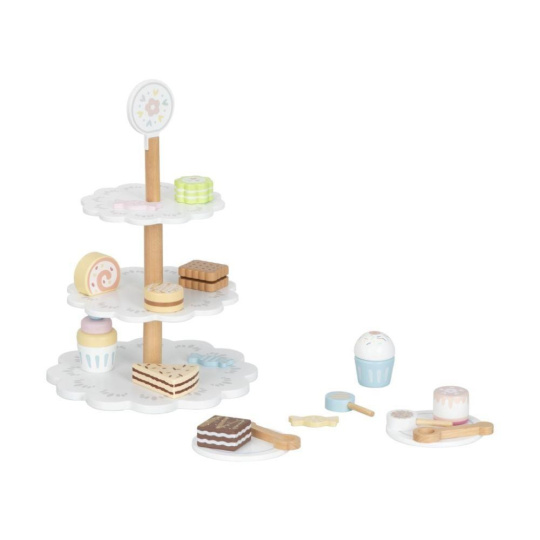 Dřevěný patrový stojan s lahodně vypadajícími dřevěnými zákusky a cukrovinkami je jako stvořený pro oslavy a čajové dýchánky uspořádané pro rodiče, kamarády i oblíbené plyšáky. Dřevěný stojan s bohatým příslušenstvím je skvělým doplňkem do dětské kuchyňky i obchůdku. Děti si mohou zahrát na cukráře i prodavače, rozvíjet svou fantazii a zdokonalovat dovednosti..