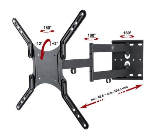 Polohovatelný držák Tv 23-55", délka až 60cm, otočný, sklopný, nosnost 45kg Nástěnný držák výborné kvality, na LCD, LED, 3D, Smart televize 23" až 55". Vynikající poměr nastavení vzdálenosti od zdi: 48mm až 595mm. Robustní odolná konstrukce držáku zvládne zavěšení televizorů s hmotností až 45kg. Televizor lze po zavěšení na držák otáčet na obě strany, naklápět, odsouvat a přisouvat ke zdi, korigovat rovinu Tv. Na ramenech jsou úchytky na kabeláž. Nástěnný úchyt poskytuje mnoho možností instalace na stěnu. Držák je dodáván v černém provedení, v balení naleznete instalační materiál a přehledný návod v CZ. Záruka 3 roky. Držák ErgoSolid Telfor - skvělá kvalita a vynikající poměr nastavení vzdálenosti od zdi 48mm až 595mm, nosnost 45kg Technické údaje: nosnost 45kg podpora VESA standardu pro zavěšení Tv a monitorů 100x100 až 400x400 doporučujeme na televizory a monitory s úhlopříčkou 23" až 55" nastavení vzdálenosti od zdi 48mm až 595mm nastavení náklonu v rozmezí +2° až -12° otáčení na obě strany až +/- 90° korekce roviny obrazovky +2° až -2° velmi pevná, robustní konstrukce úchytky na kabeláž instalační materiál barevné provedení černé záruka 3 roky Držák ErgoSolid Telfor podporuje VESA standardy pro zavěšení Tv 23-55": VESA 100x100 VESA 200x100 VESA 200x200 VESA 200x300 VESA 200x400 VESA 300x200 VESA 300x300 VESA 400x200 VESA 400x400 držák nepodporuje VESA 75x75 a 400x300.