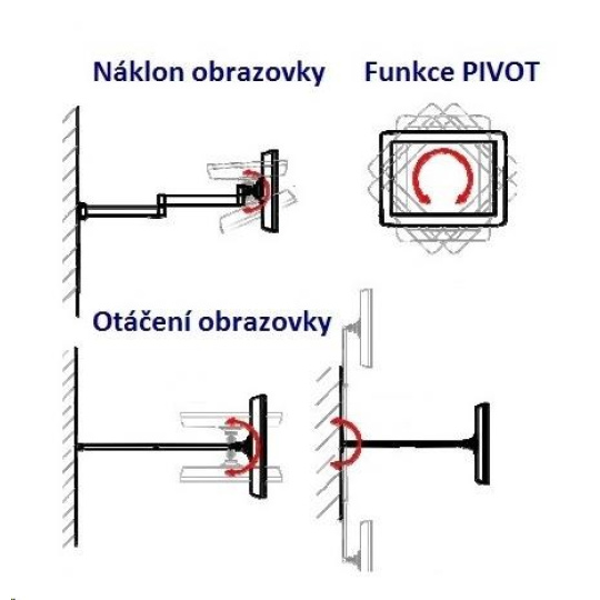 Kompletní specifikace Držák Tv nebo monitoru EDBAK GD26 Profesionální držák na televizi nebo monitor 15-43", otočný, sklopný, délkově nastavitelný, funkce pivot, VESA 75x75 a 100x100, nosnost 15kg Nástěnný držák vynikající kvality a robustní konstrukce pro zavěšení televize nebo monitoru 15-43". Držák podporuje VESA standardy 75x75 a 100x100, je možné zakoupit VESA rozšíření na 200x100 a 200x200. Po zavěšení Tv na držák můžete obrazovku otáčet na obě strany i kolmo ke zdi, naklápět nahoru a dolů, přetočit ji na šířku nebo na výšku. Vzdálenost od zdi lze nastavit v rozmezí 90-600mm. Držáky GD26 můžete zakoupit ve třech barevných variantách: černý, stříbrný nebo bílý. Nosnost držáku je 15kg. Záruka 5 let. Polohovatelný otočný sklopný a délkově nastavitelný držák na LCD LED televizory a monitory - EDBAK GD26 / drzakyastolky.cz Technické údaje: nosnost 15kg podporuje VESA standardy 75x75 a 100x100 možnost rozšíření VESA standardu na 200x100 nebo 200x200 za příplatek doporučená úhlopříčka televizoru nebo monitoru 15-43" nastavitelná vzdálenost od zdi minimální vzdálenost 90mm maximální vzdálenost 600mm funkce PIVOT - možnost otáčení obrazovky kolem osy otáčení do stran +/- 90° náklon +10° až -50° (lze i obráceně, dle montáže držáku) snadná a rychlá montáž profesionální kvalita ocelová konstrukce barva - černá, stříbrná nebo bílá záruka 5 let.