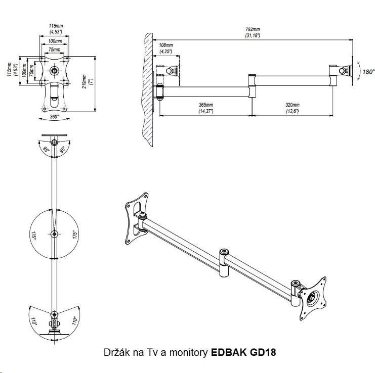 Kompletní specifikace Držák Tv nebo monitoru EDBAK GD26 Profesionální držák na televizi nebo monitor 15-43", otočný, sklopný, délkově nastavitelný, funkce pivot, VESA 75x75 a 100x100, nosnost 15kg Nástěnný držák vynikající kvality a robustní konstrukce pro zavěšení televize nebo monitoru 15-43". Držák podporuje VESA standardy 75x75 a 100x100, je možné zakoupit VESA rozšíření na 200x100 a 200x200. Po zavěšení Tv na držák můžete obrazovku otáčet na obě strany i kolmo ke zdi, naklápět nahoru a dolů, přetočit ji na šířku nebo na výšku. Vzdálenost od zdi lze nastavit v rozmezí 90-600mm. Držáky GD26 můžete zakoupit ve třech barevných variantách: černý, stříbrný nebo bílý. Nosnost držáku je 15kg. Záruka 5 let. Polohovatelný otočný sklopný a délkově nastavitelný držák na LCD LED televizory a monitory - EDBAK GD26 / drzakyastolky.cz Technické údaje: nosnost 15kg podporuje VESA standardy 75x75 a 100x100 možnost rozšíření VESA standardu na 200x100 nebo 200x200 za příplatek doporučená úhlopříčka televizoru nebo monitoru 15-43" nastavitelná vzdálenost od zdi minimální vzdálenost 90mm maximální vzdálenost 600mm funkce PIVOT - možnost otáčení obrazovky kolem osy otáčení do stran +/- 90° náklon +10° až -50° (lze i obráceně, dle montáže držáku) snadná a rychlá montáž profesionální kvalita ocelová konstrukce barva - černá, stříbrná nebo bílá záruka 5 let.