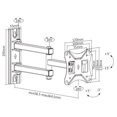 Držák na monitory a Tv Fiber Mounts FM233 Kvalitní držák na monitor nebo Tv 13-30", otočný +/-90°, sklopný +5°/-15°, výsuvný 58-365mm, VESA 75x75 a 100x100, nosnost 15kg, záruka 5 let Kvalitní polohovací držák na monitor nebo televizi s úhlopříčkou 13" až 30", který zvládne zátěž až 15kg a podporuje VESA standardy 75x75 a 100x100. Tento nástěnný držák je výsuvný 58-365mm, otáčet do stran až +/- 90°, ale i naklápět dolů nebo nahoru +5°/ -15°. Pokud se Vám nepodaří držák nainstalovat přesně do roviny, snadno svůj prohřešek napravíte - držák umožňuje korigovat rovinu obrazovky +/-3°. V balení naleznete instalační materiál, držák a přehledný návod v češtině. Držák na Tv nebo monitor Fiber Mounts FM233 Technické údaje: nosnost 15kg podpora VESA standardu 75x75 a 100x100 držák je ideální na monitor nebo televizor s úhlopříčkou 13" až 30" spolehlivá a bezpečná konstrukce s polohováním otáčení na obě strany +/- 90° náklon obrazovky dolů až o -15°, nahoru až o +5° korekce roviny obrazovky +/- 3° výsuvný - nastavení požadované vzdálenosti od zdi v rozmezí 58mm až 365mm kvalitní držák monitoru nebo menší Tv za dostupnou cenu barevné provedení černé instalační materiál, přehledný návod v CZ záruka 5 let Nástěnný držák na televizi nebo monitor Fiber Mounts FM233 Držáky na monitory a Tv Fiber Mounts FM233 podporují VESA standardy: VESA 75x75 VESA 100x100 Na nástěnný držák Fiber Mounts FM233 je možné zavěsit všechny typy a značky monitorů a televizorů, jejichž hmotnost je maximálně 15kg a které podporují některý z výše uvedených VESA standardů. Na velikosti (úhlopříčce) monitoru nebo televizoru nezáleží. Pokud potřebujete obrazovku otočit kolmo ke zdi, tak nesmí šířka televize přesáhnout 65cm.