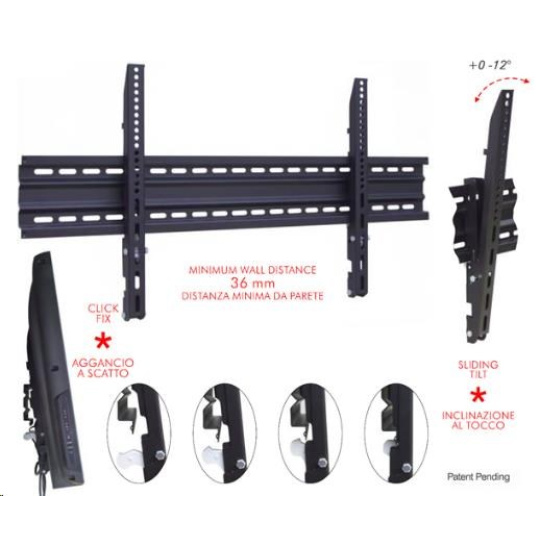 Technické údaje: nosnost 60kg na TV 37" - 65" vzdálenost od zdi pouhých 36mm náklon 0 / -12 st. VESA 100x100 - 800x400mm patentovaný systém náklonu a zajištění TV moderní design dodáván včetně materiálu na montáž odolná černá barva záruka 5 let.