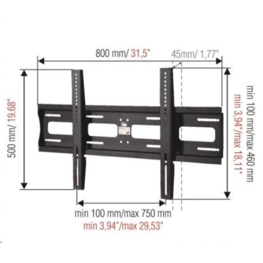 Technické údaje: nosnost 80kg VESA standard 100x100 - 720x460 doporučujeme na televizory 37" až 60" vzdálenost Tv od zdi 45mm vyrobeno z kvalitní silnostěnné ocely snadná instalace profesionální kvalita certifikovaný držák tv barevné provedení černé nebo stříbrné záruka 10 let DRŽÁK PODOPORUJE VESA STANDARDY: VESA 100x100 VESA 200x100 VESA 200x200 VESA 300x200 VESA 300x300 VESA 400x200 VESA 400x300 VESA 400x400 VESA 600x400 všechny atypické rozměry VESA standartů až do rozměrů 700x460mm.