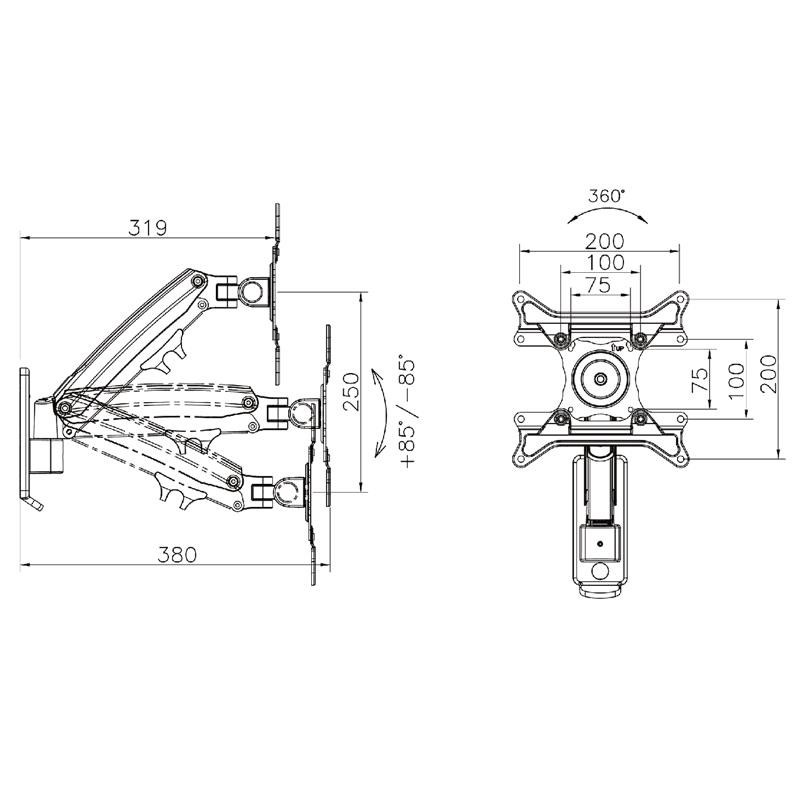 Držák Tv monitoru NB F425 Nástěnný držák na monitory a Tv 21-50", otočný +/-90°, sklopný +/-85°, výškové polohování 250mm, pivot +/-360°, úchyty na kabeláž, montážní materiál, VESA 75x75 a 100x100, nosnost 13kg Dizajnový držák s výškovým polohováním televize nebo monitoru s úhlopříčkou 21-50" a hmotností v rozmezí 3-13kg, podpora VESA standardů 75x75 a 100x100. Držák má integrovaný plynový píst, který se nastaví na hmotnost obrazovky, díky tomu je výškové polohování snadné a rychlé - bez nářadí, bez námahy. Držák umožňuje plné nastavení polohy Tv: výškové polohování 250mm, otáčení do stran dle velikosti obrazovky až +/-90°, naklápění +/-85°, vysouvání a zasouvání ke zdi 100-380mm, rotaci obrazovky díky funkci pivot +/- 360°. Velmi snadná instalace. Barevné provedení černé. Balení obsahuje montážní materiál. Záruka 3 roky. Nástěnný držák na televize a monitory s nastavením výšky NB F425 Technické údaje: na televizory a monitory s hmotností 3 kg až 13 kg podporuje VESA standardy 75x75 až 100x100 ideální na Tv a monitory s úhlopříčkou 21" až 50" nastavení vzdálenosti od zdi 100 mm až 380 mm nastavení náklonu obrazovky +/- 85 ° otáčení obrazovky do stran +/- 90 ° výškové polohování 250 mm funkce PIVOT - rotace obrazovky +/- 360° TOP kvalita, snadné polohování, krásný design barevné provedení černé instalační materiál součástí balení záruka 3 roky Výškově polohovatelný, otočný, sklopný a výsuvný držák na Tv a monitory NB F425 Držák Tv monitoru NB F425 podporuje VESA standardy: VESA 75x75 VESA 100x100 Držák F425 je vhodný na všechny typy a značky televizorů, které mají hmotnost 3-13 kg a které podporují kterýkoliv z výše uvedených VESA standardů. Na úhlopříčce televize nezáleží - uvedené úhlopříčky jsou pouze orientační..