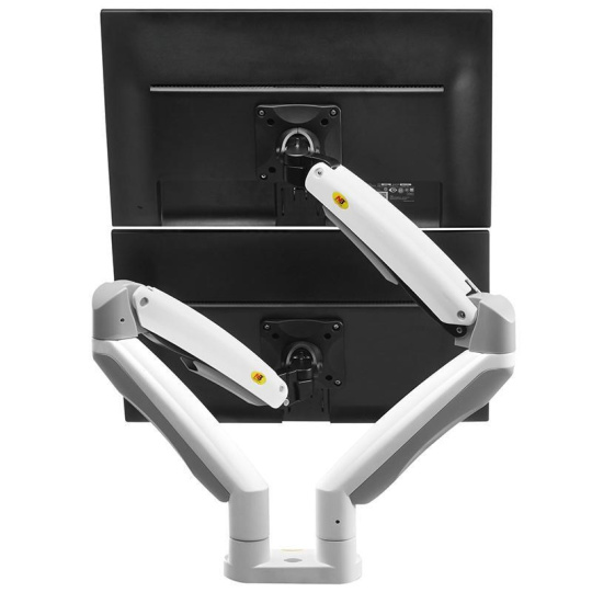 Dvoumonitorový stolní držák NB F195AW Profesionální stolní držák na 2 monitory 21-32", 3D nezávislé nastavení polohy, bílé provedení, profesionální kvalita Špičkový stolní držák pro zavěšení 2 monitorů a jejich nezávislé nastavení polohy: otáčení do stran, nastavení výšky, nastavení vzdálenosti od stolního úchytu, náklon, rotace obrazovky, korekce roviny. Různé nastavení polohy monitorů - vedle sebe na šířku, vedle sebe na výšku, pod sebou na šířku, nebo jeden monitor na šířku a druhý na výšku. Hmotnost každého monitoru musí být v rozmezí 3-9kg. Balení obsahuje 2 typy úchytů na stolovou desku, instalační materiál a návod. Barevné provedení bílé. Záruka 3 roky. Bílý držák na dva monitory, polohovatelný, profesionální kvality, záruka 3 roky - Mounts F195AWProfesionální bílý držák na 2 monitory, různé polohování monitorů, plně nastavitelný držák, TOP kvalita - Mounts F195AW Bílý držák na dva monitory, do kanceláře, pracovny, nemocnice, ordinace. Top kvalita, snadné polohování. Držák 2 monitorů Mounts F195AW Technické údaje: celková nosnost 18kg hmotnost každého monitoru musí být v rozmezí 3 ÷ 9 kg podpora VESA standardu 75x75 a 100x100 v případě potřeby za příplatek možnost rozšíření VESA na 200x100 nebo 200x200 doporučená úhlopříčka monitorů 21" až 32" nezávislé nastavení výšky: min. 220mm, max. 565mm nezávislé otáčení monitoru do stran +/- 180° nezávislé naklonění monitoru +53° až -8° nezávislá rotace monitoru - otočení monitoru na šířku nebo na výšku, korekce roviny nezávislé nastavení vzdálenosti od stolního úchytu: 0mm až 700mm uchycení na stolové desky o průměru 10mm až 90mm balení obsahuje 2 typy úchytů na stolové desky (na okraj, do prostoru) 2x USB port vynikající kvalita, krásný design snadné nastavení polohy monitorů spolehlivost, bezpečnost barevné provedení bílé, stříbrné nebo černé záruka 3 roky Mounts F195AW - bílý stolní držák pro nezávislé zavěšení a polohování dvou monitorů Dvoumonitorový stolní držák NB F195AW podporuje VESA standardy: VESA 75x75 VESA 100x100 za příplatek rozšíření na VESA 200x100 za příplatek rozšíření na VESA 200x200 Bílý držák na dva monitory Mounts F195AW Velmi pěkný bílý držák na dva monitory, nezávislé polohování každého monitoru, snadná nastavitelnost, profesionální kvalita a zpracování. Ideální držák do moderních kanceláří, ordinací, nemocnic nebo pracoven..