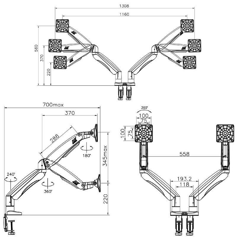Dvoumonitorový stolní držák NB F195AW Profesionální stolní držák na 2 monitory 21-32", 3D nezávislé nastavení polohy, bílé provedení, profesionální kvalita Špičkový stolní držák pro zavěšení 2 monitorů a jejich nezávislé nastavení polohy: otáčení do stran, nastavení výšky, nastavení vzdálenosti od stolního úchytu, náklon, rotace obrazovky, korekce roviny. Různé nastavení polohy monitorů - vedle sebe na šířku, vedle sebe na výšku, pod sebou na šířku, nebo jeden monitor na šířku a druhý na výšku. Hmotnost každého monitoru musí být v rozmezí 3-9kg. Balení obsahuje 2 typy úchytů na stolovou desku, instalační materiál a návod. Barevné provedení bílé. Záruka 3 roky. Bílý držák na dva monitory, polohovatelný, profesionální kvality, záruka 3 roky - Mounts F195AWProfesionální bílý držák na 2 monitory, různé polohování monitorů, plně nastavitelný držák, TOP kvalita - Mounts F195AW Bílý držák na dva monitory, do kanceláře, pracovny, nemocnice, ordinace. Top kvalita, snadné polohování. Držák 2 monitorů Mounts F195AW Technické údaje: celková nosnost 18kg hmotnost každého monitoru musí být v rozmezí 3 ÷ 9 kg podpora VESA standardu 75x75 a 100x100 v případě potřeby za příplatek možnost rozšíření VESA na 200x100 nebo 200x200 doporučená úhlopříčka monitorů 21" až 32" nezávislé nastavení výšky: min. 220mm, max. 565mm nezávislé otáčení monitoru do stran +/- 180° nezávislé naklonění monitoru +53° až -8° nezávislá rotace monitoru - otočení monitoru na šířku nebo na výšku, korekce roviny nezávislé nastavení vzdálenosti od stolního úchytu: 0mm až 700mm uchycení na stolové desky o průměru 10mm až 90mm balení obsahuje 2 typy úchytů na stolové desky (na okraj, do prostoru) 2x USB port vynikající kvalita, krásný design snadné nastavení polohy monitorů spolehlivost, bezpečnost barevné provedení bílé, stříbrné nebo černé záruka 3 roky Mounts F195AW - bílý stolní držák pro nezávislé zavěšení a polohování dvou monitorů Dvoumonitorový stolní držák NB F195AW podporuje VESA standardy: VESA 75x75 VESA 100x100 za příplatek rozšíření na VESA 200x100 za příplatek rozšíření na VESA 200x200 Bílý držák na dva monitory Mounts F195AW Velmi pěkný bílý držák na dva monitory, nezávislé polohování každého monitoru, snadná nastavitelnost, profesionální kvalita a zpracování. Ideální držák do moderních kanceláří, ordinací, nemocnic nebo pracoven..