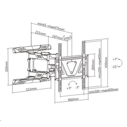Špičkový nástěnný držák s polohováním Tv 32-80", otočný, sklopný, výsuvný Nástěnný držák na televize, který vyniká skvělou nastavitelností, výbornou konstrukcí a krásným dizajnem. Vhodný je na všechny typy a značky televizí, jejichž hmotnost není vyšší jak 45kg a které podporují VESA standardy od 200x200 do 400x400. Unikátní konstrukce držáku umožňuje zasunutí televize ke zdi na vzdálenost pouhých 41mm a maximální vysunutí až na vzdálenost 475mm. Otáčení je možné na obě strany minimálně o 60°, náklon je solidních 15° dolů nebo 7° nahoru. Držák podporuje korekci roviny obrazovky, konstrukce je osazena kryty pro vedení kabeláže. Držák Fiber Mounts Super-2 doporučujeme i náročným uživatelům, díky své kvalitě, dizajnu, nastavitelnosti, kvalitnímu zpracování a dostupné ceně je dostupný téměř každému. Fiber Mounts Super-2 je špičkový držák na televize 37-80" za skvělou cenu, vhodný nejen pro náročné uživatele Technické údaje: nosnost 45kg podpora VESA standardu 200x200 až 400x400 vhodný na televize s úhlopříčkou 32" až 80" výsuvný, nastavení vzdálenosti od zdi 41mm až 475mm otočný do stran, minimálně +/- 60° náklopný, směrem dolů až o 15°, nahoru až o 7° korekce roviny obrazovky +/- 3° ultra tenká, silnostěnná konstrukce vynikající bezpečnost a stabilita bez prověšení ramen i při maximálním zatížení a maximálním vysunutí krásný dizajn krytky pro vedení kabeláže barevné provedení černé záruka 5 let Nástěnný výsuvný ultraslim držák na Tv Fiber Mounts Super-2 podporuje VESA standardy: VESA 200x200 VESA 300x200 a 200x300 VESA 300x300 VESA 400x200 a 200x400 VESA 400x300 a 300x400 VESA 400x400.