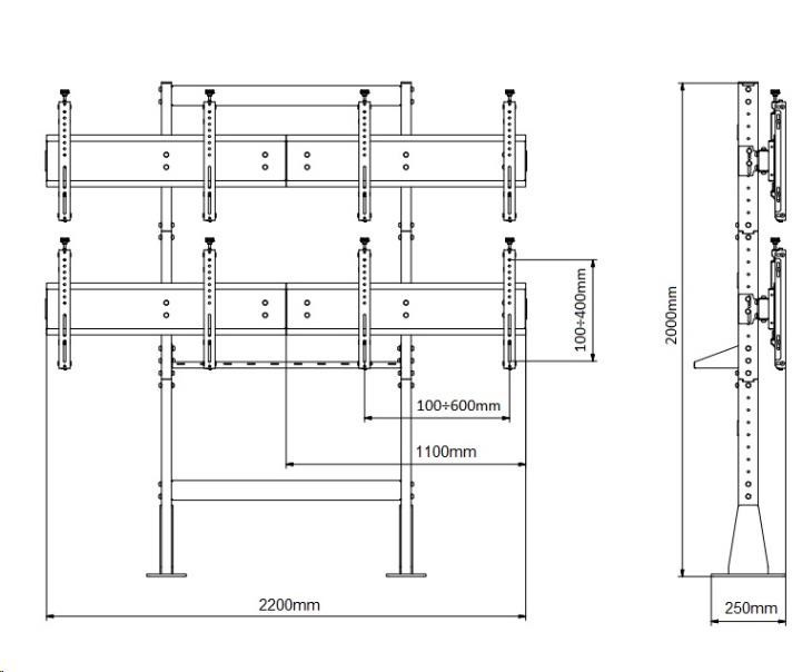 Technické údaje: maximální zatížení 210kg maximální hmotnost 1 monitoru nebo televizoru 50kg na televizory a monitory s úhlopříčkou 50÷57" zavěšení obrazovek v horizontální poloze podpora VESA standardu 100x100 ÷ 600x400mm výška televizní stěny 2000mm výškové nastavení každé řady monitorů dle potřeby posun monitorů do stran zajištění proti vysazení monitoru nutné ukotvení do podlahy profesionální televizní stěna nejvyšší kvality a zpracování snadné sestavení, rychlá montáž záruka 10 let Podporované VESA standardy: VESA 100x100 VESA 200x100 a 100x200 VESA 200x200 VESA 300x200 a 200x300 VESA 300x300 VESA 400x200 a 200x400 VESA 400x300 a 400x400 VESA 400x400 VESA 600x400.