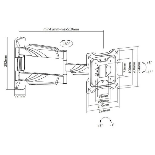 Elegantní plně nastavitelný Tv držák Fiber Mounts DF4 Držák na Tv 23" až 55", otáčení do stran +/-90°, naklápění +5°/-15°, výsuvný 45-510mm, korekce roviny +/-3°, VESA standard 75x75 až 200x200, krytky na kabeláž, nosnost 35kg, záruka 5 let Pokud chcete zavěsit televizi na opravdu kvalitní televizní držák a neutratit majlant, tak do svého výběru určitě zařaďte držák Fiber Mounts DF4. Kvalitní televizní držák, který je elegantní a přitom má velmi pevnou a spolehlivou konstrukci. Zavěsit můžete televize s úhlopříčkou 23-55", které mají hmotnost až 35kg. Tv držák DF4 podporuje VESA standardy 75x75 až 200x200, má systém pro ukrytí kabeláže, instalaci usnadní možnost korekce roviny obrazovky. Barevné provedení černé, záruka 5 let. Elegantní televizní držák s velmi pevnou, robustní konstrukcí. Snadné polohování televize, výsuvný, otočný, sklopný, korekce roviny, ukrytí kabeláže, TOP kvalita a dizajn, nízká cena držáku - Fiber Mounts DF4 Technické údaje: maximální zatížení 35kg na televize i monitory s úhlopříčkou 23-55" podporuje VESA standardy 75x75 až 200x200 výsuvný od zdi 45 mm až 510 mm otáčení Tv na obě strany +/- 90° naklápění Tv nahoru až 5°, dolů až 15° korekce roviny obrazovky +/- 3° dizajnové krytky pro ukrytí kabeláže silnostěnná ocelová konstrukce v elegantním provedení velmi snadné polohování televize snadná a rychlá instalace barevné provedení černé záruka 5 let Velmi pevná a robustní konstrukce, přitom televizní držák Fiber Mounts DF4 působý a vypadá velmi elegantně Snadná instalace televizního držáku Fiber Mounts DF4 na zeď, do rohů místností, na pilíře i sloupy Elegantní televizní držák Fiber Mounts DF4 podporuje VESA standardy: VESA 75x75 VESA 100x100 VESA 200x100 VESA 200x200 Na Tv držák Fiber Mounts DF4 můžete zavěsit všechny značky, typy a velikosti televizorů, které mají hmotnost maximálně 35kg a které podporují kterýkoliv z výše uvedených VESA standardů. Velikost televize není podstatná..