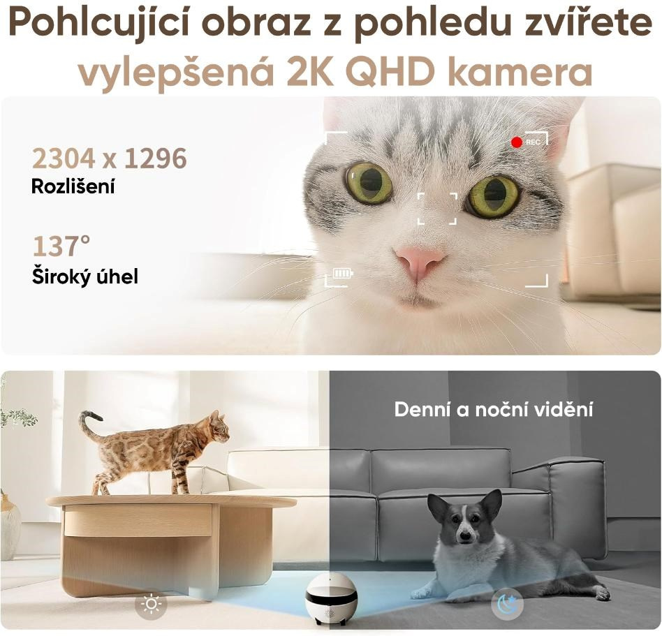Špičková 2K kamera přináší ostré a realistické záběry v každé situaci. Široký zorný úhel 137° umožňuje zachytit větší část místnosti bez nutnosti otáčet kamerou, takže snadno sledujete dění i v rozích prostoru. Díky vysoké kvalitě obrazu a plynulému streamování je robot ideální pro monitorování domácnosti i nahrávání nezapomenutelných okamžiků vašich mazlíčků.