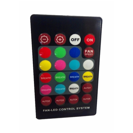 - dálkové ovládání (možnost volby barvy podsvětlení s možností vypnutí, řízení otáček ventilátorů s možností vypnutí)
