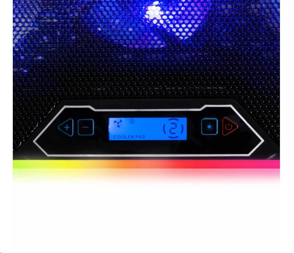 Chladicí podložku EVOLVEO Ania 9 RGB s RGB podsvícením využijete pro notebooky o velikosti 10-17". Bezesporu oceníte možnosti nastavení polohy a regulaci otáček ventilátoru. Pomocí tlačítek u displeje lze přepínat mezi třemi barevnými módy (modrá, zelená a červená) a čtyřmi RGB módy, které osvětlují okraj podložky. Podržením tlačítka pro ovládání barevných módů podobu delší 3s dojde k zapnutí/vypnutí LED na okraji podložky. Tlačítkem pro regulaci otáček lze navolit jednu ze 4 rychlostí ventilátorů a tyto pak zcela vypnout.