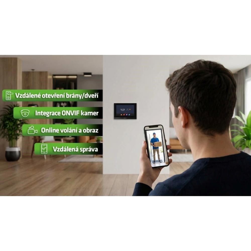 Interiérová jednotka není jen obrazovka pro přijetí hovoru. Sedmipalcový kapacitní dotykový monitor s rozlišením 1024 × 600 px funguje jako komunikační centrum celého systému.