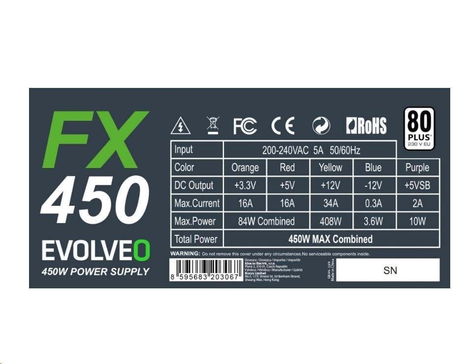 EVOLVEO FX 450, zdroj 450W ATX, 14cm, tichý, 80+, bulk, záruka 3 roky