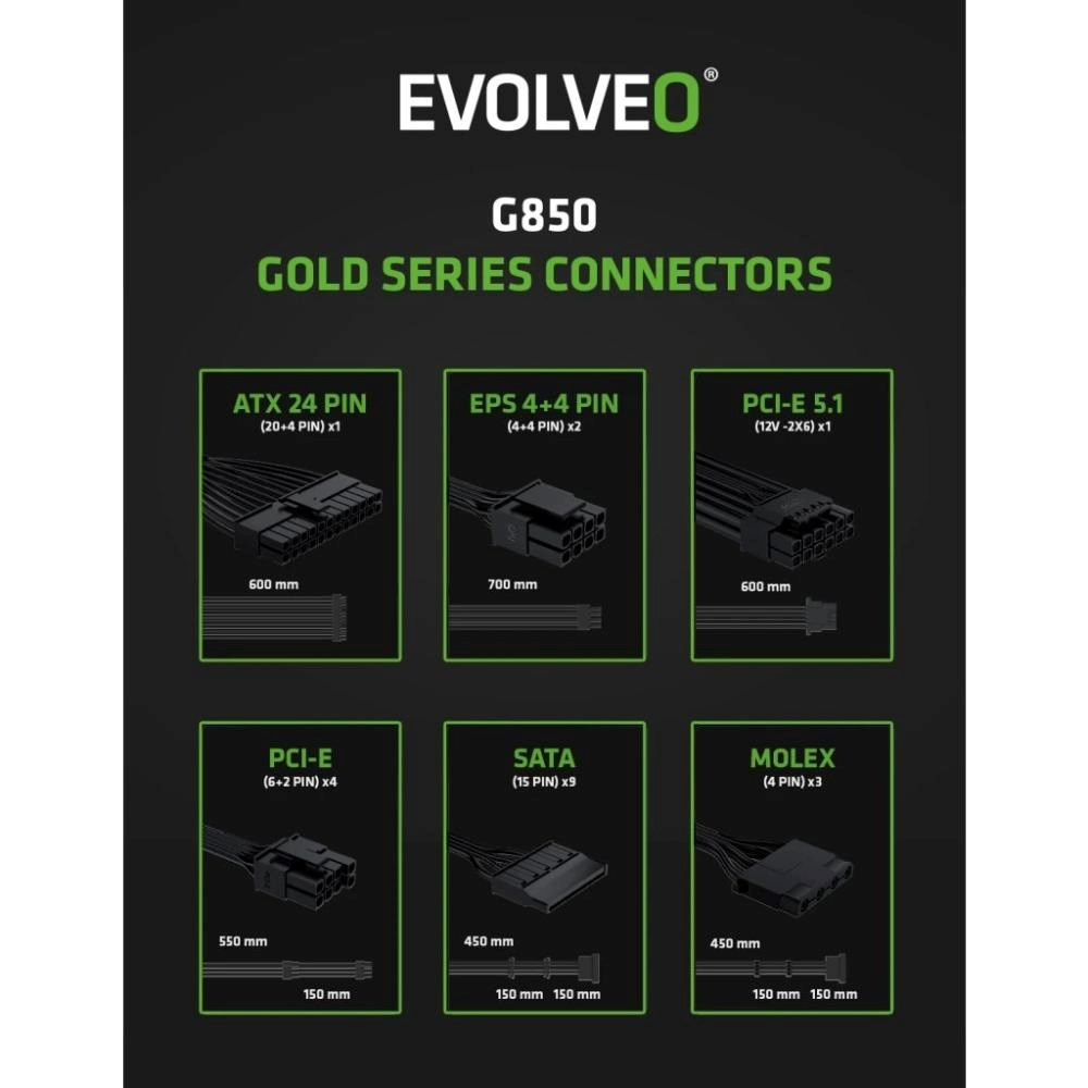 EVOLVEO G850 zdroj 850W, 80+ GOLD, ATX 3.1, aPFC, 140 mm ventilátor, záruka 3 roky, bílý