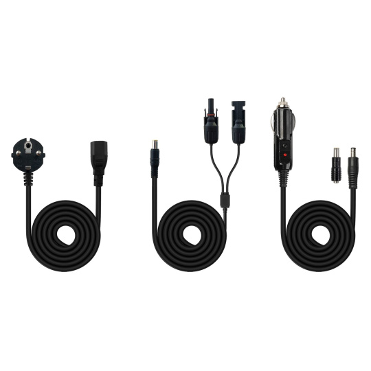 - Nabíjecí kabely v balení: 1× do zásuvky 230 V, 1× do auta a 1× pro solární panel
