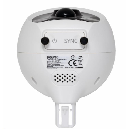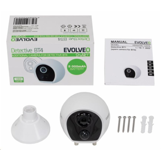 Náhradní kamera určená pro rozšíření instalace EVOLVEO Detective BT4. Kamera je vybavená akumulátorem s 5000mAh kapacitou. Pod krytkou se nachází USB-C konektor pro nabíjení a tlačítko pro zapnutí/vypnutí a párovací režim. Kamera je vybavená nočním IR přísvitem a PIR čidlem pro rozeznání pohybu. Součástí kamery je i mikrofon a reproduktor pro obousměrnou hlasovou komunikaci.