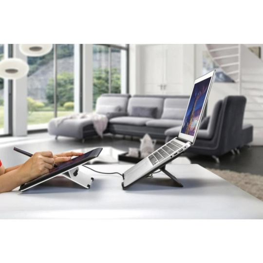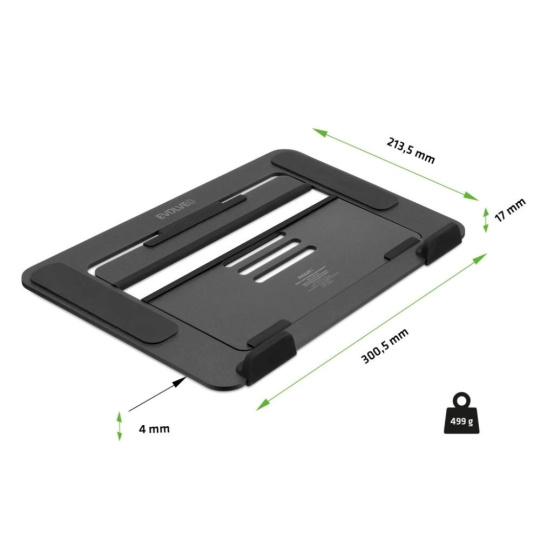 Rozměry 300,5 × 213,5 × 4 mm a hmotnost 499 g dělají z tohoto podstavce pod notebook ideálního parťáka pro všechny, kteří střídají kancelář, home office, coworking a kavárnu. Všude tam si s ním totiž snadno obstaráte vlastní pracovní místo, na které jste zvyklí.