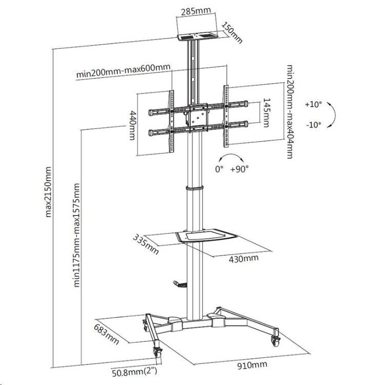 Exkluzivní mobilní stojan na televize Fiber Novelty FN5000 Televizní stojan výborné kvality a unikátní konstrukce, která umožňuje plnou nastavitelnost pozice Tv Velmi pěkný televizní stojan s unikátní konstrukcí, díky které velmi snadno nastavíte výšku televizoru i náklon, držák má funkci pivot díky kterému můžete dát obrazovku klasicky na šířku (horizontálně) nebo i na výšku (vertikálně). Podstava stojanu je osazena 4 kvalitními pojezdovými kolečky s brzdou, díky kterým je stojan mobilní a snadno se sním manipuluje. Stojan je dodáván včetně příslušenstí - univerzální držák na televizory nebo monitory s úhlopříčkou 37-70", podporuje VESA standard 200x200-600x400, poličkou na příslušenství a horní poličkou na kameru nebo projektor. Obě poličky jsou volitelným příslušenstvím - na stojan je můžete nebo nemusíte dát. Nosnost stojanu je 50kg, je velmi stabilní a bezpečný. Vhodný je pro využití na konferencích, výstavách, prezentacích, v kancelářích, čekárnách, recepcích i v domácnostech. Barevné provedení černé, záruka 3 roky. Exkluzivní stojan na televizi nebo monitor, nastavení výšky pomocí kliky bez nářadí, nastavení sklonu, funkce pivot, polička na A/V a polička na kameru, stabilní, bezpečný, TOP kvalita - Fiber Novelty FN5000 Technické údaje: nosnost 50kg podporuje VESA standardy 200x200 až 600x400 univerzální držák pro zavěšení Tv nebo monitoru s úhlopříčkou 37-70" plynulé nastavení výšky obrazovky pomocí kliky výškové nastavení pomocí kliky, bez nářadí, 1175mm až 1575mm možnost náklonu obrazovky + 10° až - 10° funkce PIVOT - rotace obrazovky pro nastavení do horizontální nebo vertikální polohy polička na A/V příslušenství s nosností 5kg (instalace není nutná) rozměry A/V police 430x335mm polička na kameru nebo projektor s nosností 4kg (instalace není nutná) rozměry horní police 285x150mm robustní podstavec zajistí skvělou stabilitu a bezpečnost rozměry podstavy 910x683mm pojezdová kolečka s brzdou zajistí skvělou mobilitu systém pro fixaci kabeláže na zadní straně stojanu velmi pěkný design unikátní systém pro snadné a rychlé nastavení výšky pomocí kliky instalační materiál (univerzální sada šroubů, podložek pro zavěšení obrazovky) barevné provedení černé záruka 3 roky Stojan FN5000 je dodáván včetně držáku pro zavěšení Tv nebo monitoru s podporou VESA standardu: VESA 200x200 VESA 300x200 a 200x300 VESA 300x300 VESA 400x200 a 200x400 VESA 400x300 a 300x400 VESA 400x400 VESA 600x400.