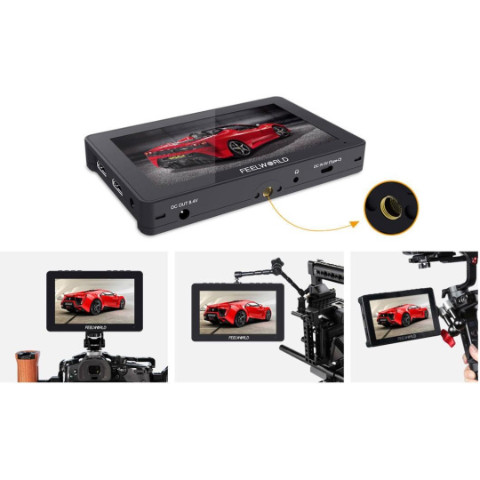 F5 Pro má standardní 1/4" montážní body (nahoře, dole, vpravo, uprostřed vzadu) pro připevnění k fotoaparátům a jiným zařízením. Nejen, že jej můžete nainstalovat na monitor pomocí naklápěcího ramene, ale také jej můžete připevnit na stabilizátor nebo jej bezpečně připevněte k horní části vašeho fotoaparátu jako ultimátní HD hledáček! Pokud jej nainstalujete na spodní část zařízení, můžete také kombinovat funkci převrácení obrazu pro zachování správné orientace obrazovky!