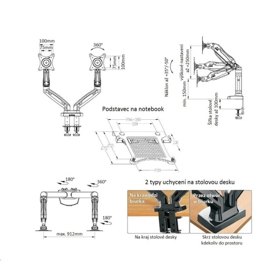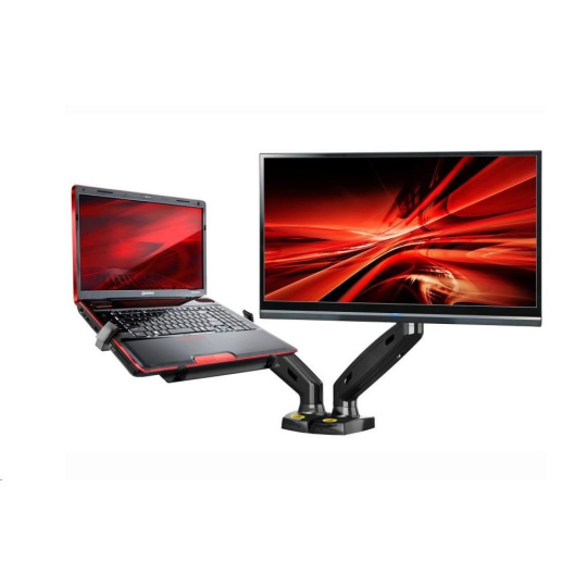 Fiber Mounts H3F160 držák notebooku a monitoru    Sestava držáku na monitory NB F160 + držáku na notebook Ergosolid NBH3 za zvýhodněnou cenu, umožňuje dát na držák monitor 17" - 27" a notebook 10,1" - 17", otáčení do stran, naklápění, délkové a výškové polohování, nosnost 2x 9 kg     Špičkový stolní držák do kanceláře, firmy nebo domácnosti pro zavěšení monitoru a notebooku. Držák umožňuje kompletní polohovatelnost jak monitoru tak i notebooku - otáčení do stran, náklon, délkové a výškové nastavení, korekci roviny. Ramena mají systém pro vedení kabeláže. Uchycení je možné na všechny typy stolů nebo desek o síle 10mm až 100mm, jsou možné 2 způsoby uchycení - na kraj stolové desky nebo kamkoliv do prostoru (ukotvení skrz stolovou desku - nutný otvor). Stolní držák pro uchycení notebooku (laptopu) a monitoru Fiber Mounts H3F160 je vynikající kvality, velmi pěkného designu a poskytujeme na něj záruku 5 let.     Stolní držák na monitor a notebook do kanceláře, pracovny, firmy nebo domácnosti Fiber Mounts H3F160         Technické údaje:  možné zatížení každého ramene 2kg až 9kg celková nosnost držáku 18kg podporuje VESA standardy 75x75 a 100x100 doporučená úhlopříčka monitoru 17" až 27" na notebooky a laptopy 10,1" až 17" výškové polohování 250mm otočný +180° / -180° náklon +35° / -50° funkce pivot - otočení monitoru do horizontální nebo vertikální polohy korekce roviny monitoru i notebooku vhodný pro uchycení všech notebooků a laptopů, které mají šířku 255-380 mm systém pro vedení kabeláže výborná kvalita krásný design záruka 5 let.